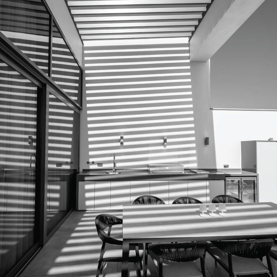 The lighting in these units follows the same creative angle, designed and installed by the companies SulSolar and Atelier DMarq. Thanks to the interplay of the various forms of lighting provided, different indoor and outdoor environments can be created at the push of a button.